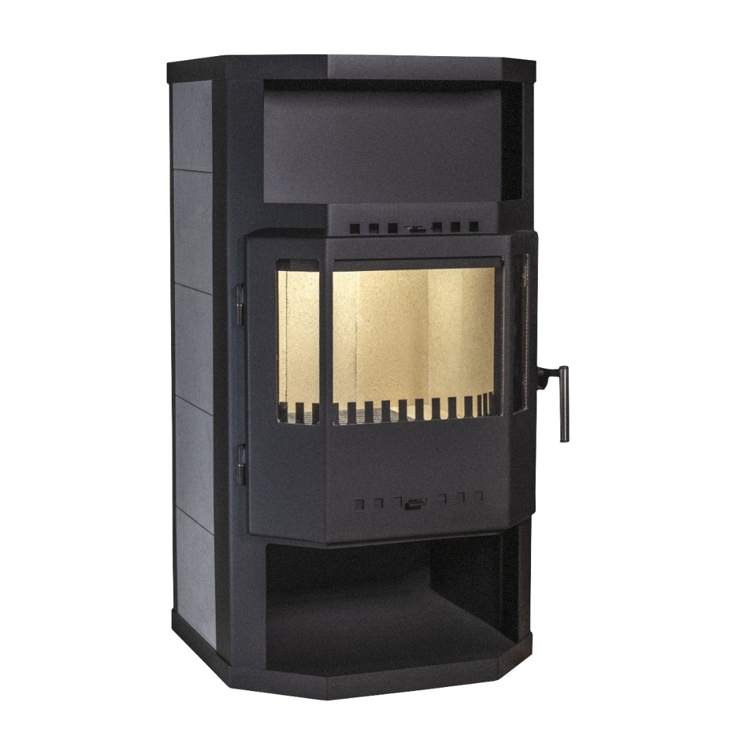 Стальная печь-камин “Ангара” с призматическим остеклением дверцы топки и облицовкой из керамической плитки с легкостью справится с обогревом помещения объемом до 180 куб. метров. Вытянутый вверх корпус позволяет установить печь как у стены, так и в углу, а дымоход вывести сверху или сзади, по желанию владельца.