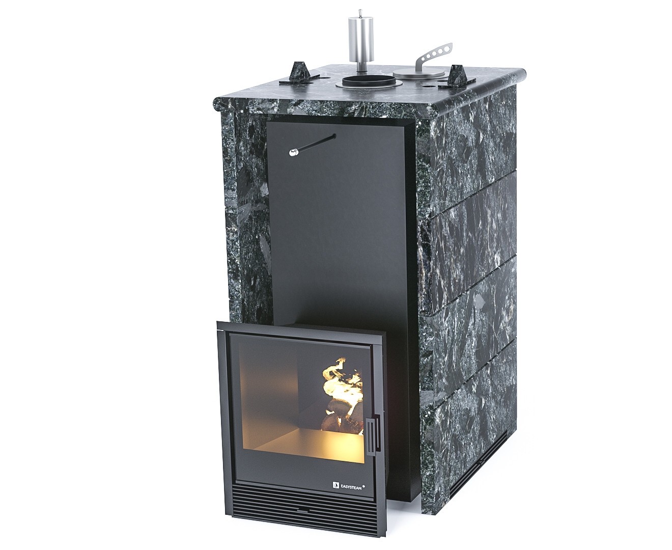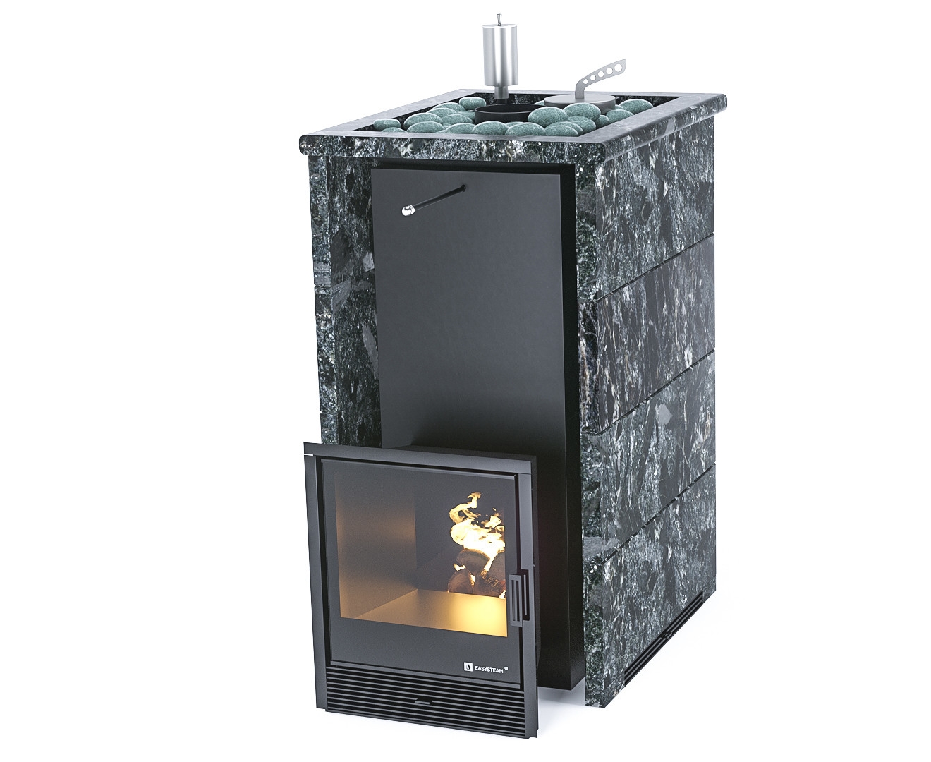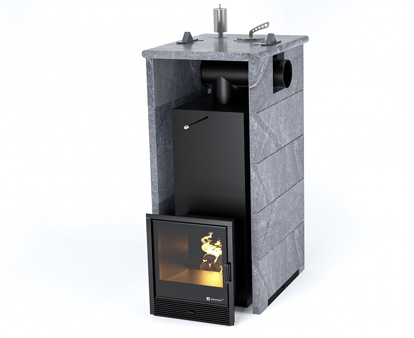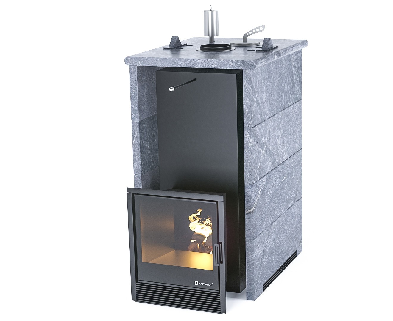 Печь Геленджик М2 полноценном кожухе с боковым подключением Талькохлорит, каменка Справа, дымоход Сп