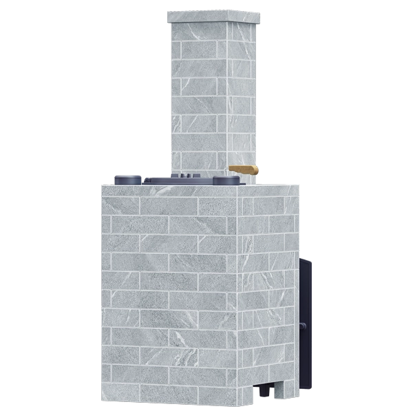 Форма куба и отсутствие отдельных опор на нижнем ярусе обеспечивает устойчивость на подиуме, а прочные крепления из алюминиевого сплава исключают расхождение плит. Перекрытие облицовки выполнено из 2-х плит так, чтобы отверстие под выход дымохода находилось между плитами и давало возможность проводить монтаж с уже установленным дымоходом без дополнительного демонтажа. Расположенные по краям облицовки заливные горловины для поддачи воды декорированы каменными хомутами, которые могут быть выполнены в цилиндрической или восьмигранной форме по Вашему выбору.